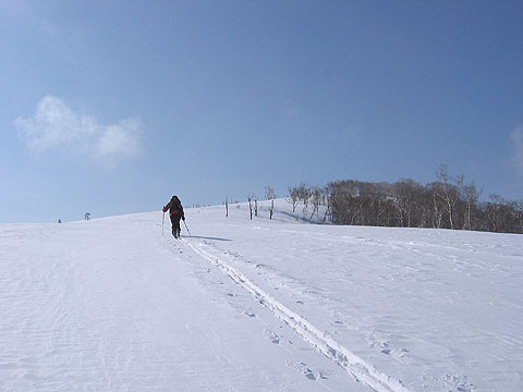この付近一帯は放牧地跡なのだろうか、眼下にも雪原が広がっている。遠望は変わらず霞んでいた、「これで札幌近郊の山々とか徳舜瞥山やホロホロ山なんかが見えていればねぇ〜〜〜」、ちょっと贅沢な望みを口にした。しかしこんなおだやかな青空の下を歩けるチャンスなどなかなか無いだろう、出来れば一度に手中にしたかったのだが・・・ |